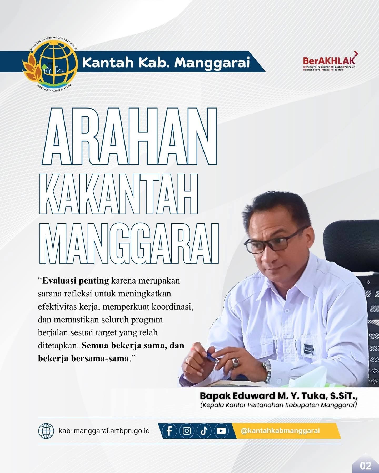 Evaluasi juga, menurut mantan Kakantah Kabupaten Ngada ini, memiliki makna dan tujuan strategis dalam siklus manajemen organisasi di Kantor Pertanahan Kab. Manggarai.